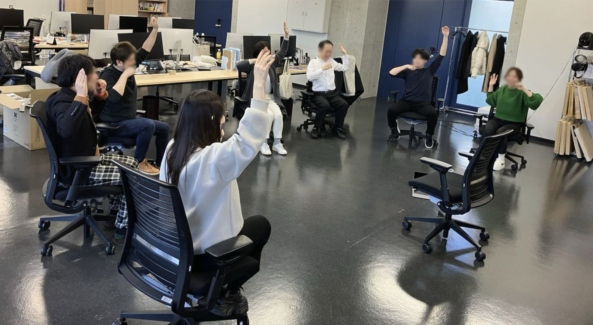 issinは、この課題にいち早く対応し、毎日平日の15時に、社員がトレーナー役となるグループエクササイズを実施することで、座りすぎの解消と社員の健康促進を図っています。グループエクササイズの内容は、ストレッチや軽い筋力トレーニング、リフレッシュを目的とした動きを取り入れ、デスクワーク中心のライフスタイルでも無理なく継続できるよう工夫されています。
