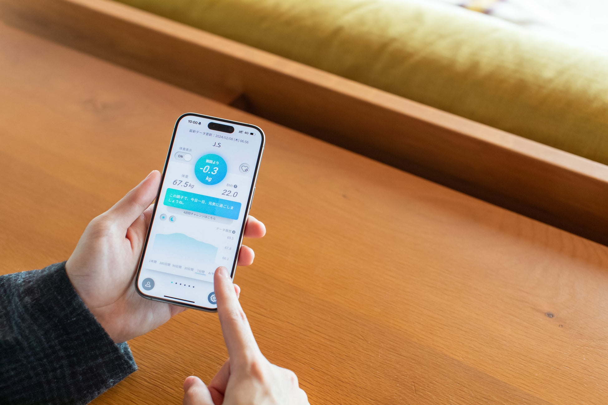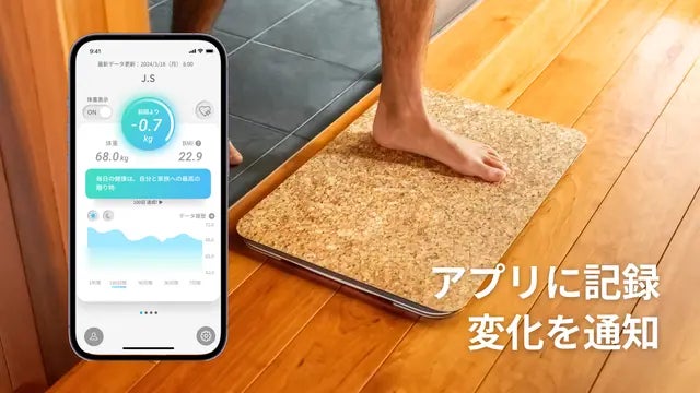 乗るだけで、スマホアプリに「体重の増減」「BMIの変化」を記録します。一般的なスマホ連動の体重計と違い、Wi-Fi接続のため、毎回Bluetooth接続する必要もありません。