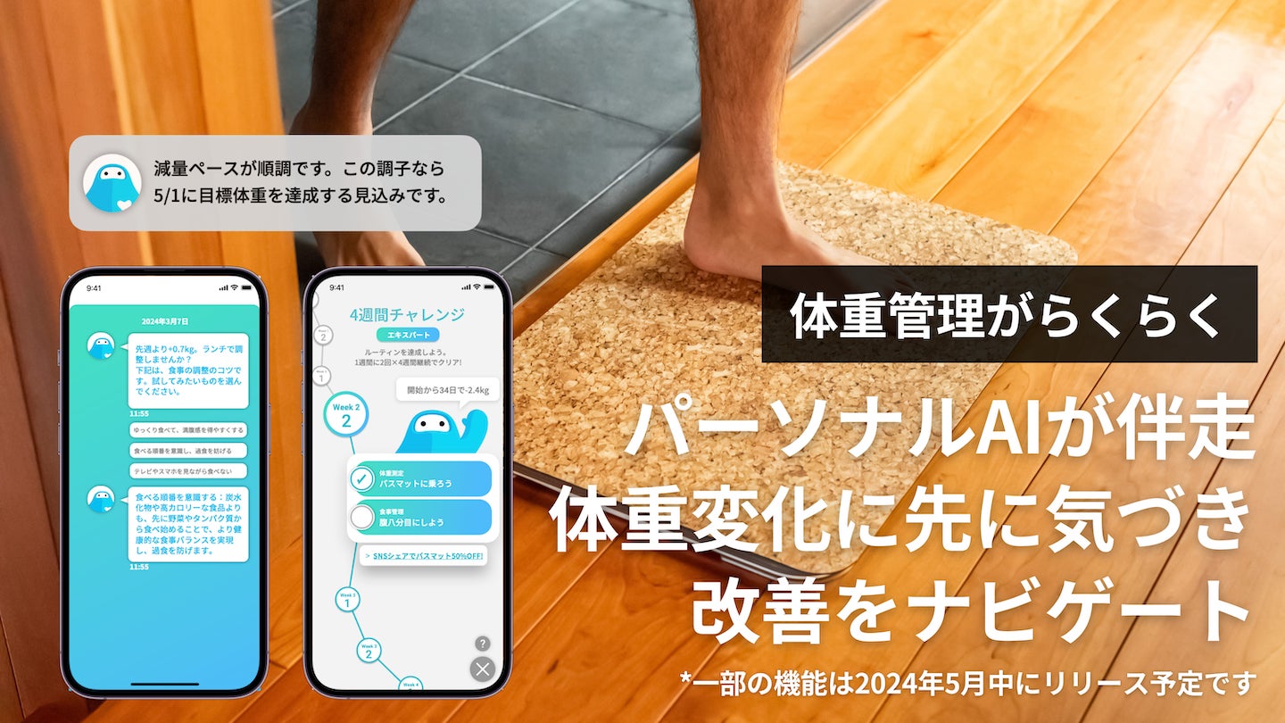 従来の多くの体重計とは異なり、ニーズに応える形で機能追加・アップデートを繰り返し行っている点が特徴で、目的やライフステージに合わせた6つの体重管理モードや、家族間のプライバシーにも配慮した共有機能が実装されています。また、「AI体重未来予測」機能により、ユーザーのデータをAIが解析し、未来の体重変化の傾向を先読みし予測します。この機能によって、ダイエットのモチベーション向上や、ダイエット後のリバウンド防止、高齢者のフレイル予防に繋がります。さらには、パーソナルヘルスケアAI「ウェリーくん」があなたの変化に気づき、食事と運動の改善案を提案し、寄り添いながらナビゲートします。