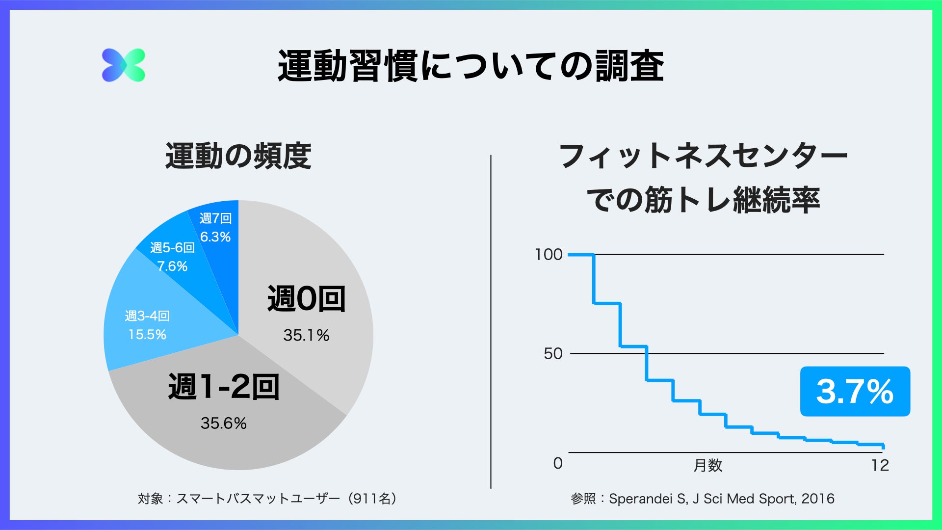 スマートバスマットの提供を通じて、あらゆるユーザーの体重管理に寄り添う中で、運動習慣に関する課題や要望が多く見受けられました。また、「スマートバスマット」ユーザー向けにアンケートを実施(有効回答数911人)し、運動実施頻度を聞いたところ、週0回が35.1%、週1〜2回が35.6%であり、約7割が運動の機会が少ない(*1)ことがわかりました。さらに、運動などの新たな習慣を始めても、1年間以上継続できた方の割合はわずか3.7%となっており(*2)、行動を始めること、継続し習慣化することは非常に難しいという実態が明らかになりました。