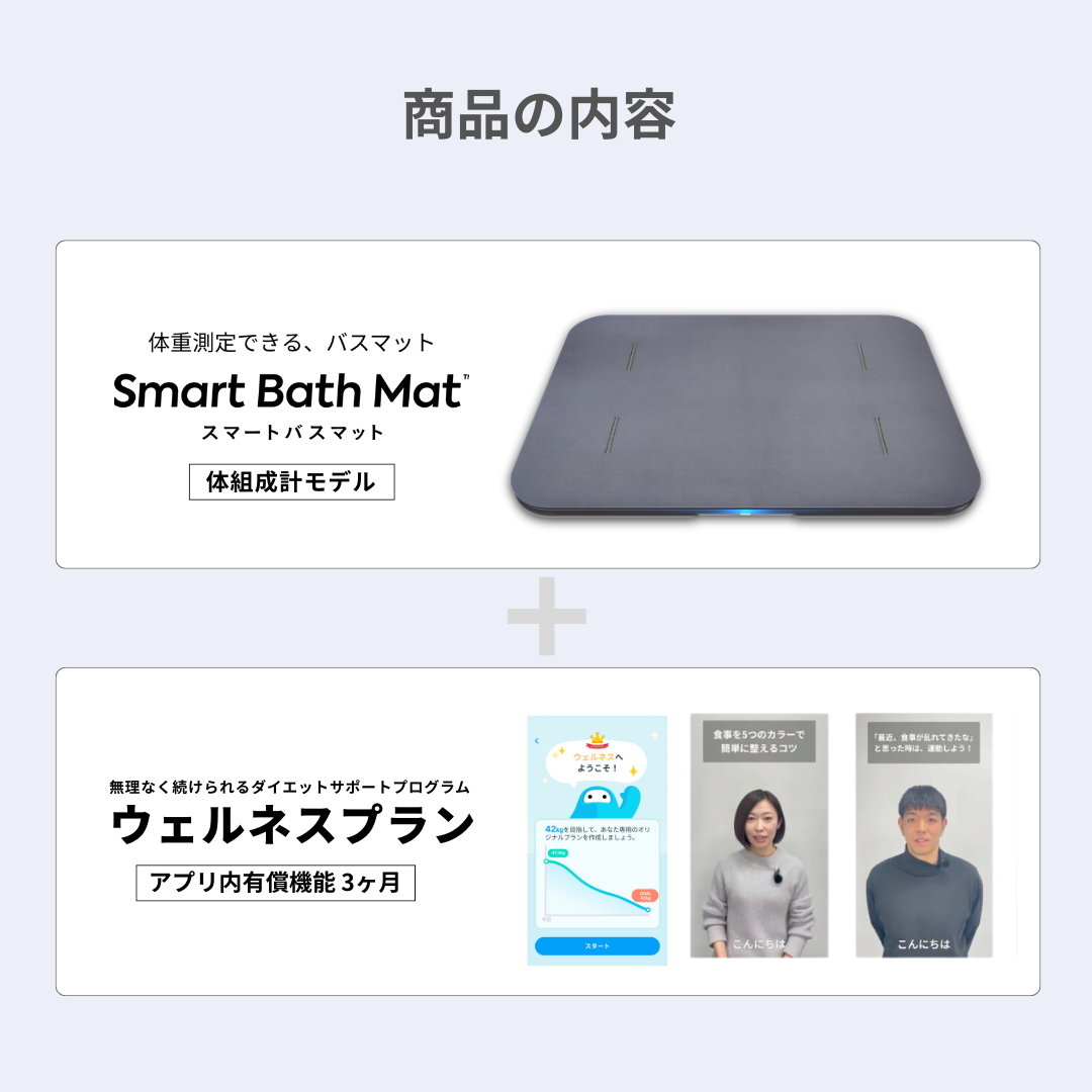 A. 毎日お風呂上がりにスマートバスマットで体重を計測。生活スタイルや目標に合わせた簡単アクションをゲーム感覚で実行。食事もスマホで写真を撮るだけで記録され、AIや専門家チームが適宜サポートします。